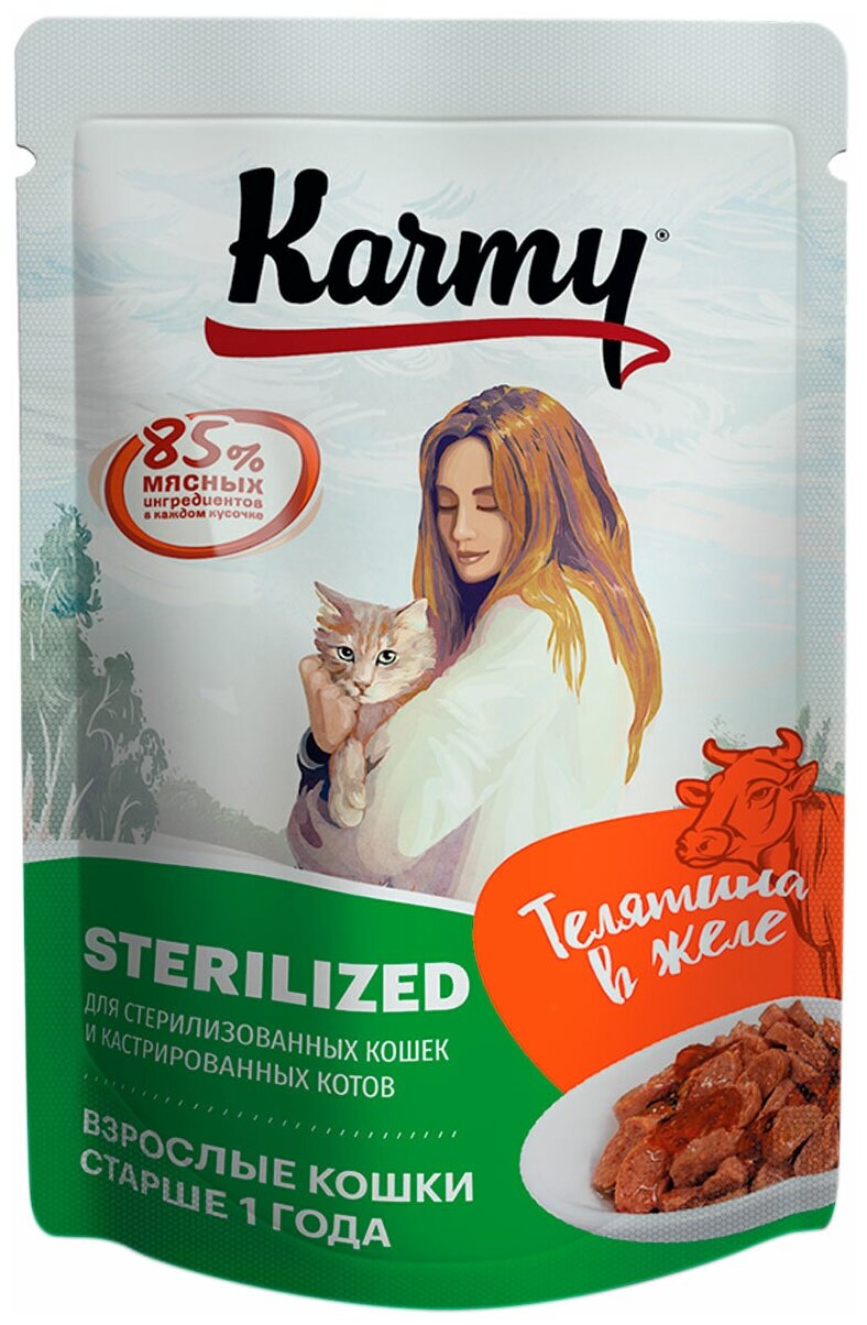 Корм Karmy Sterilized (в желе) для стерилизованных кошек, с телятиной, 80 г x 24 шт