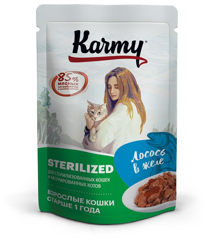 Влажный корм KARMY STERILIZED для стерилизованных кошек и кастрированных котов старше 1 года Лосось в желе Паучи 24шт по 80г