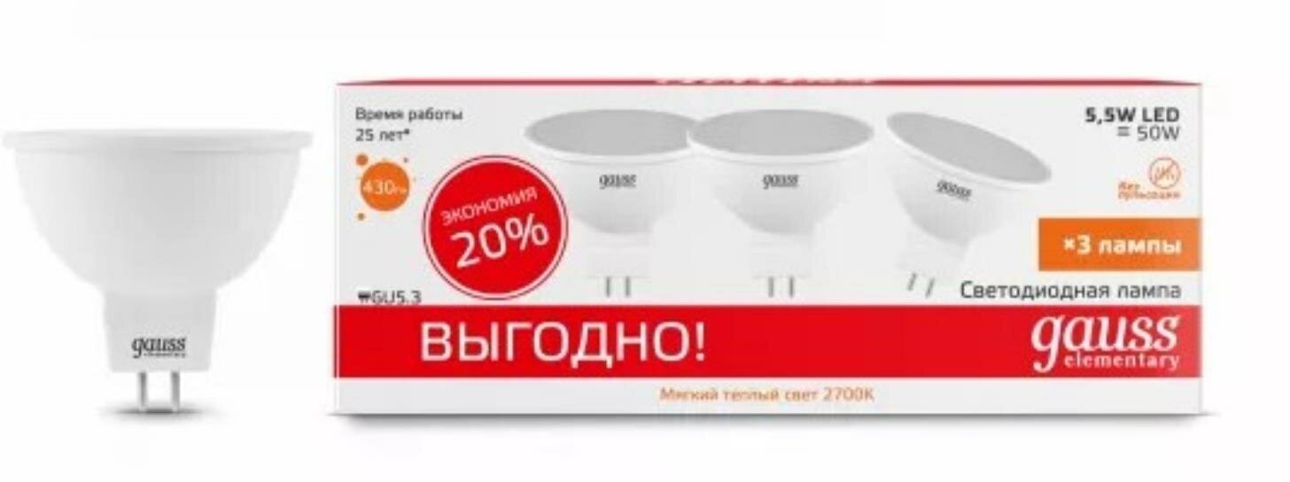 Светодиодная лампа Gauss LD13516 5.5W эквивалент 50W 3000K 430Лм GU5.3 для спотов MR16 (комплект из 3 шт)