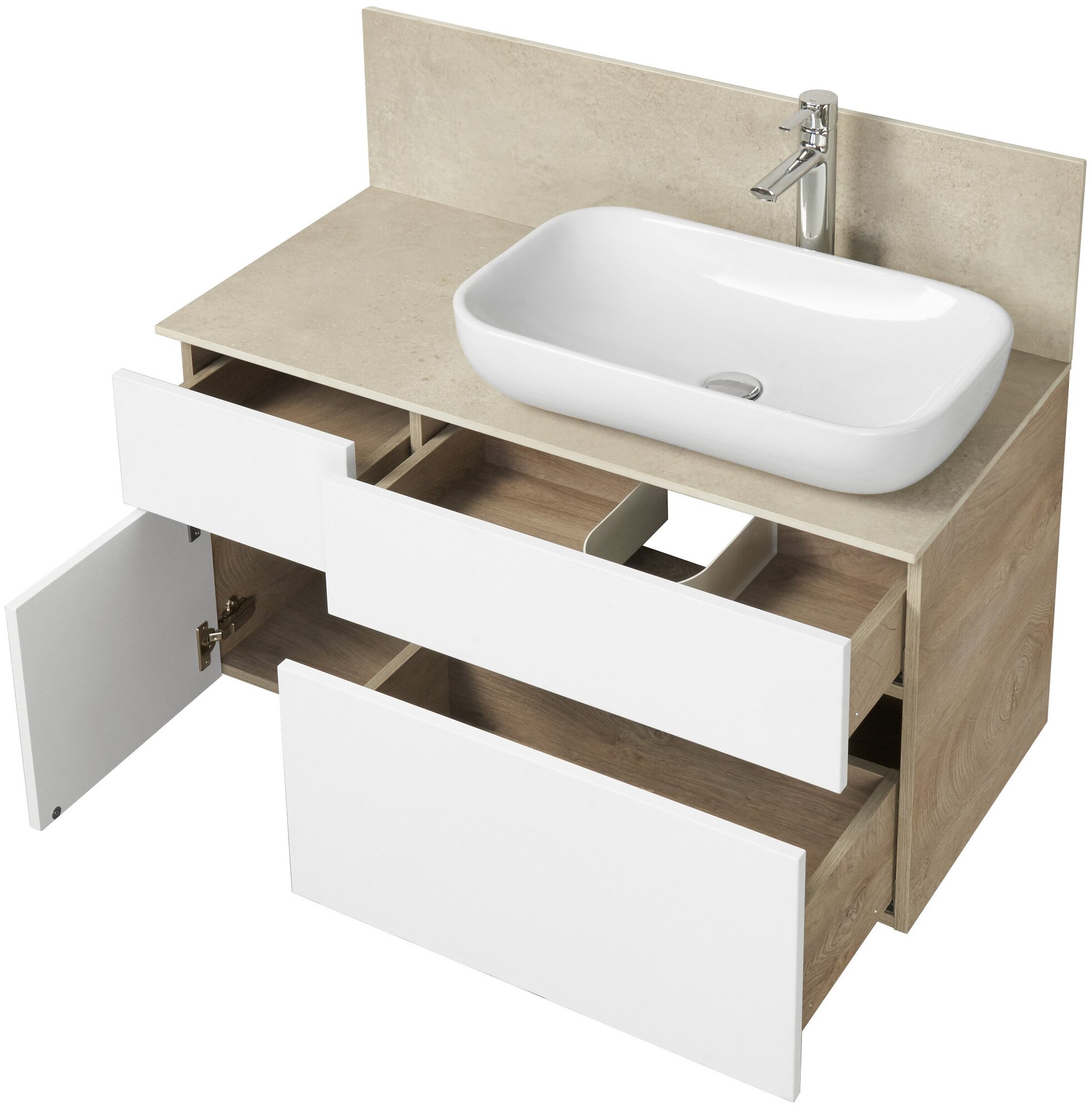 | Комплектация | 1 большой выдвижной ящик, 1 небольшой внутренний выдвижной ящик; без раковины и смесителя |