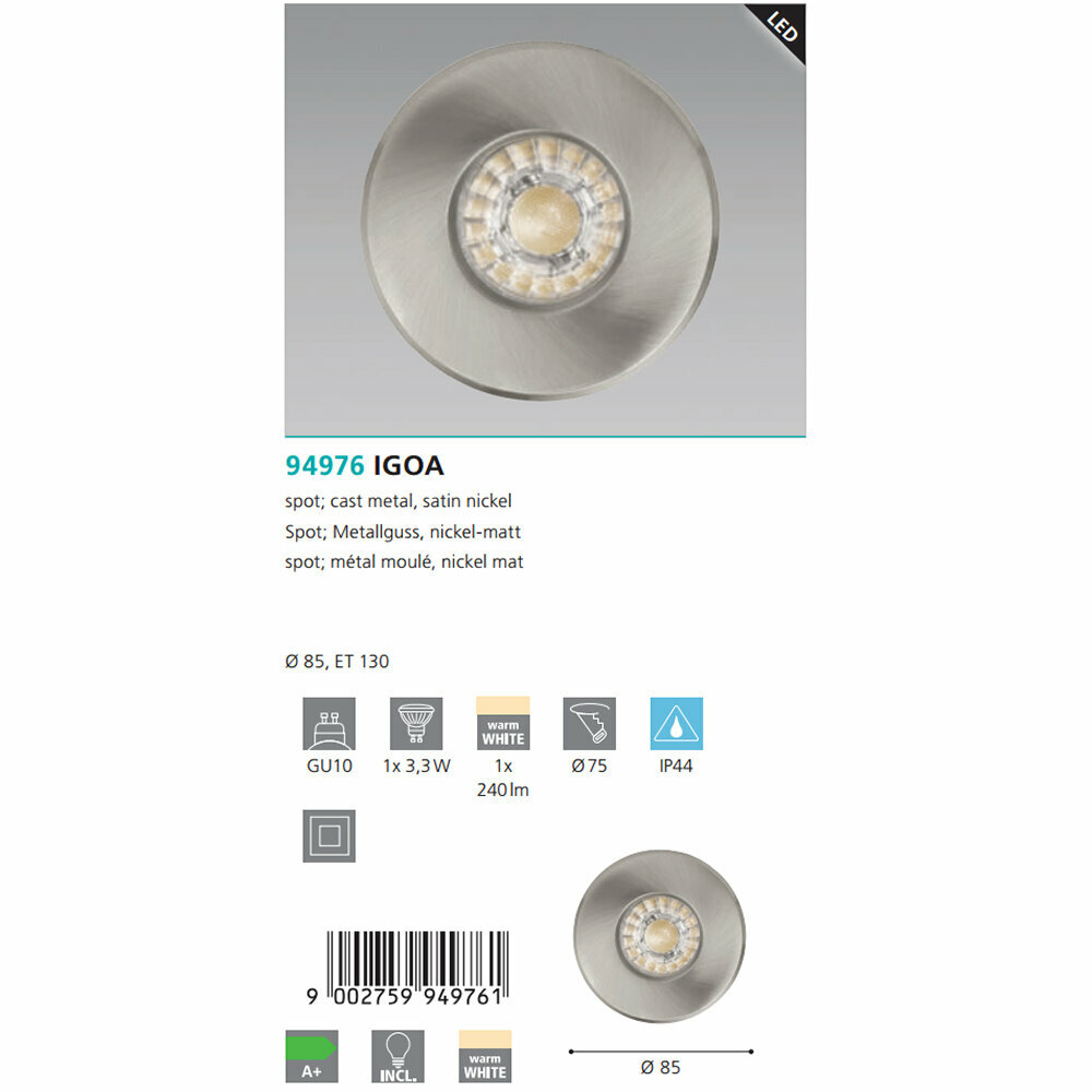 94976 Светодиодный встраиваемый светильник IGOA, 1x3,3W (GU10), Ø85, IP44, литой металл, никель мато