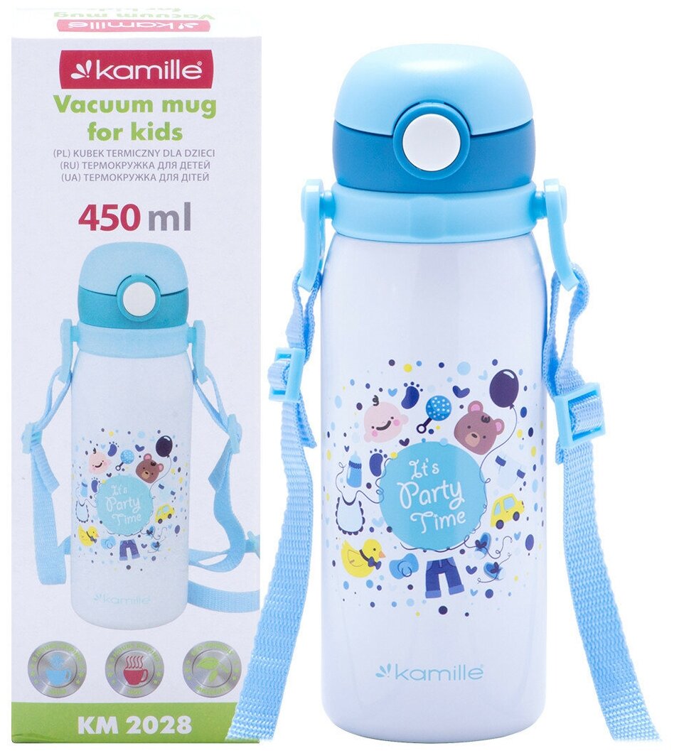 Термос для детей 450 мл. из нержавеющей стали Kamille КМ-2028 с трубочкой и ремешком (24 / голубой)