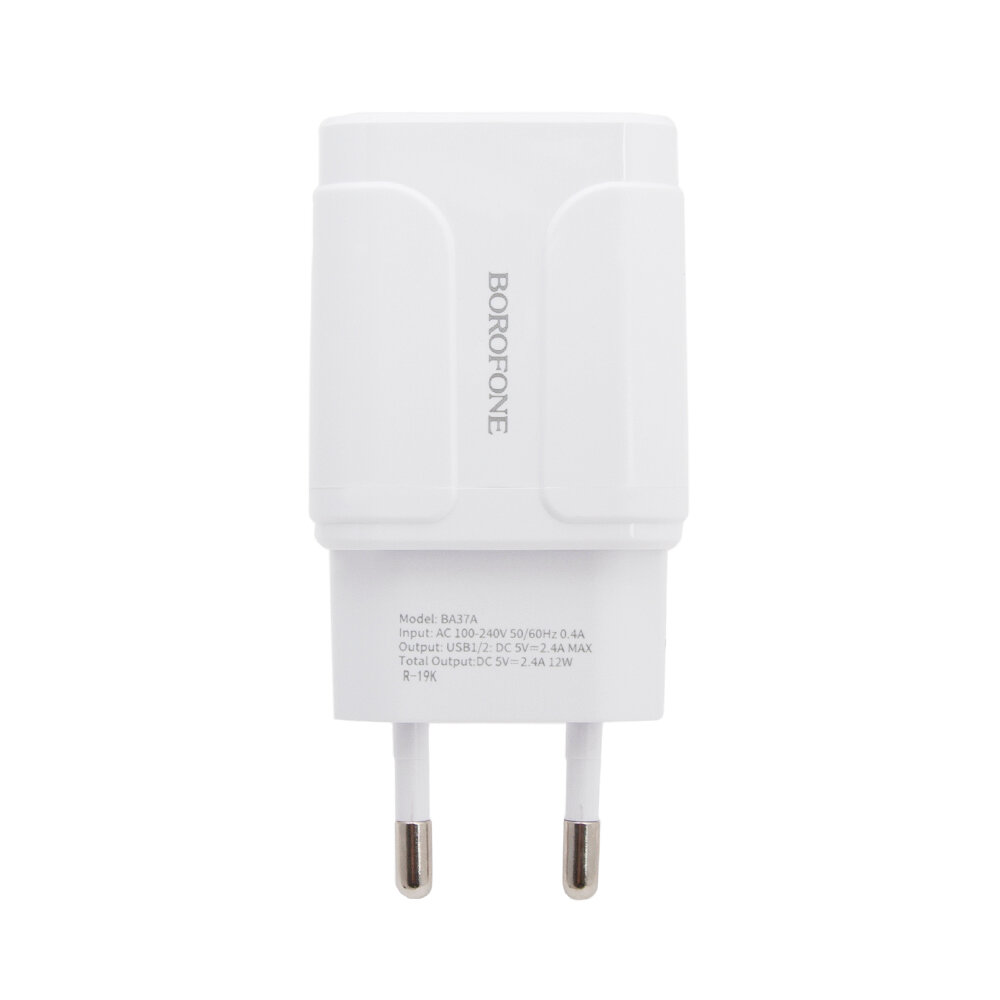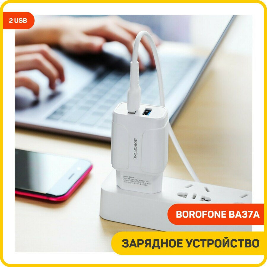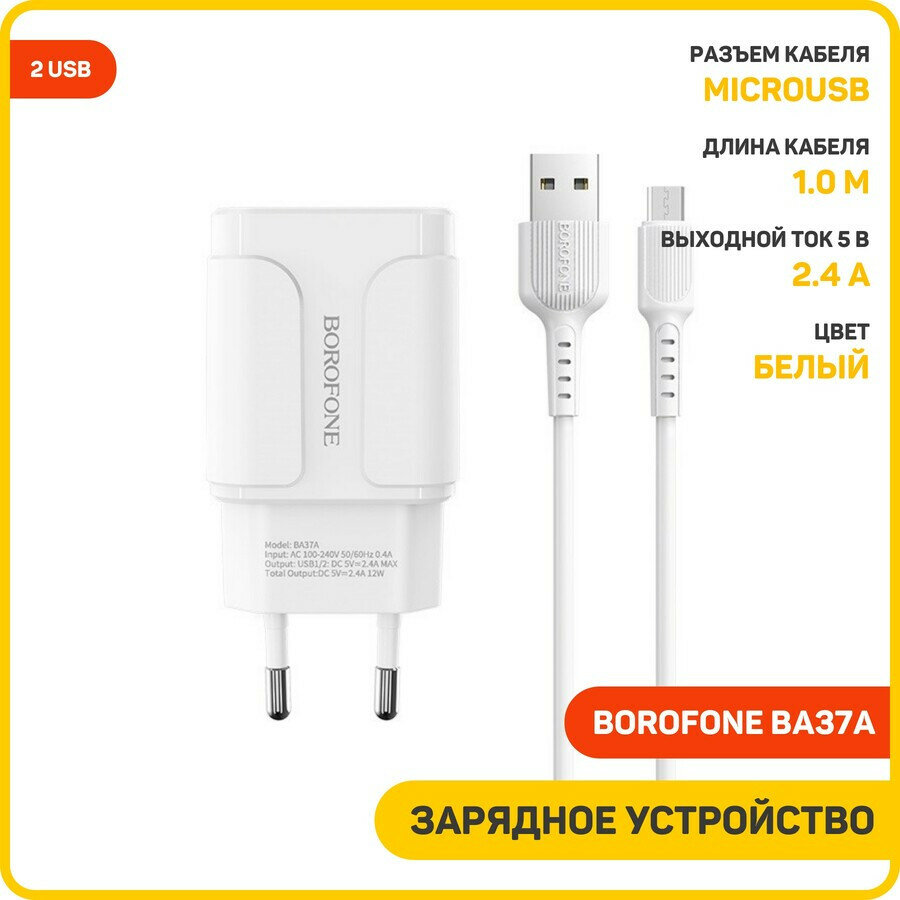 Купить Сетевое зарядное устройство (СЗУ) Borofone BA37A (2 USB) + кабель MicroUSB, 2.4 А, белый