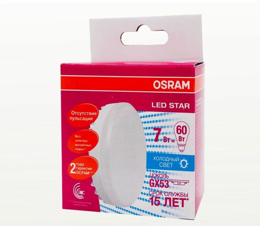 10шт/уп. Лампа LED Таблетка 7Вт 220-240V GX53 550Лм 4000К Угол 120 град. D-75mm L-24mm Свет Дневной белый OSRAM, уп. 10шт