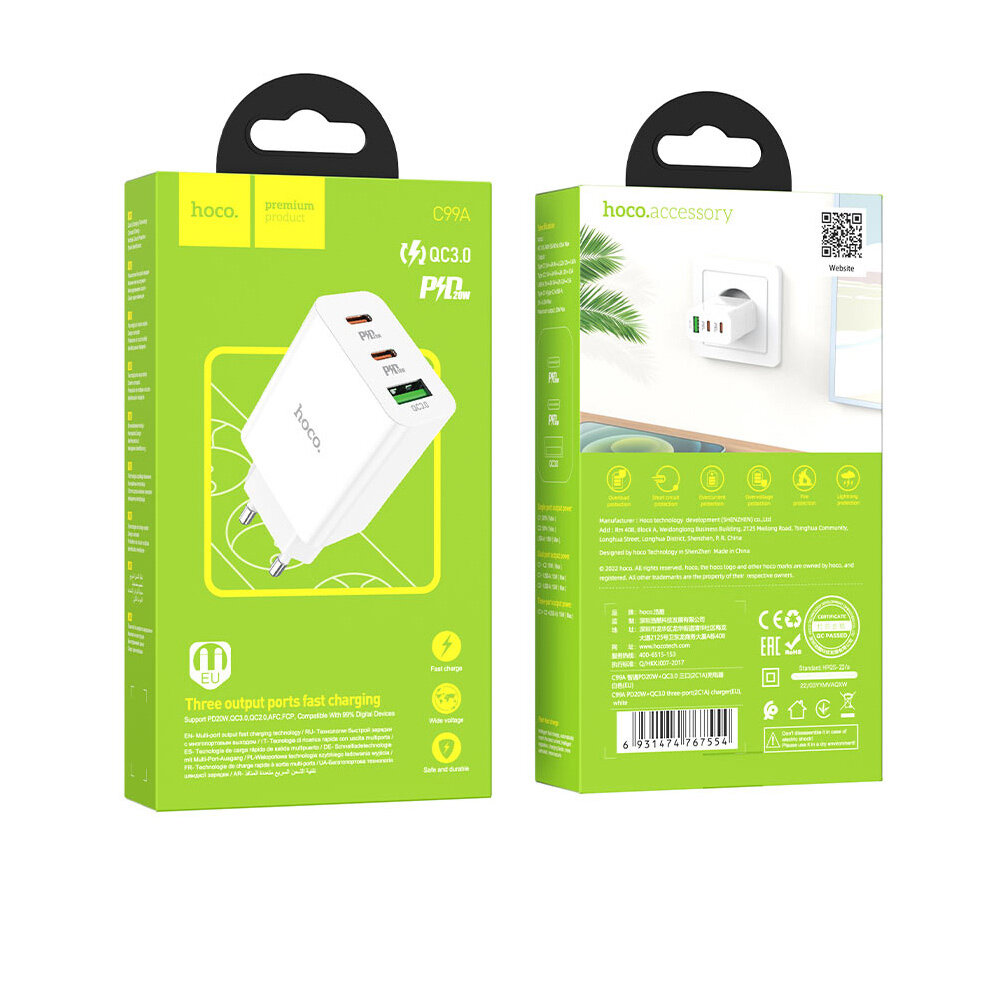 Купить Зарядное устройство Hoco C99A, USB QC3.0 + Type-C*2, PD20W + Кабель USB to micro USB 1м, Белый