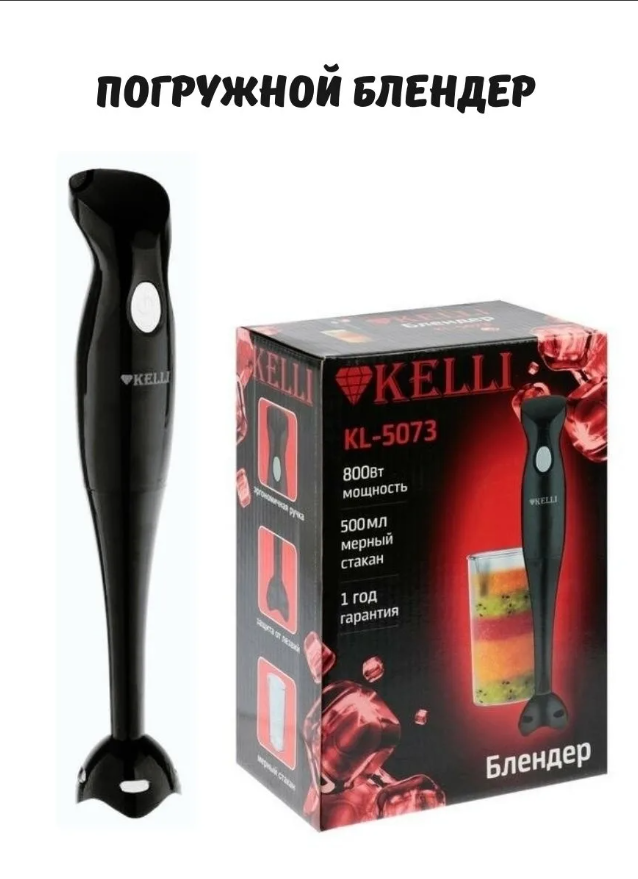 Блендер KELLI KL-5073, погружной, 800 Вт, 1 скорость, стакан 0.5 л, чёрный Kelli 6709307