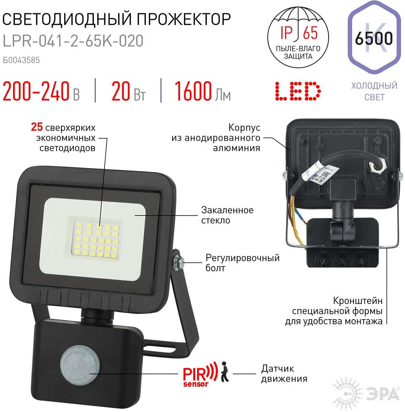 ЭРА LPR-041-2-65K-020 20Вт 1600Лм 6500К датчик движения регулируемый 100x130x45 Б0043585 .