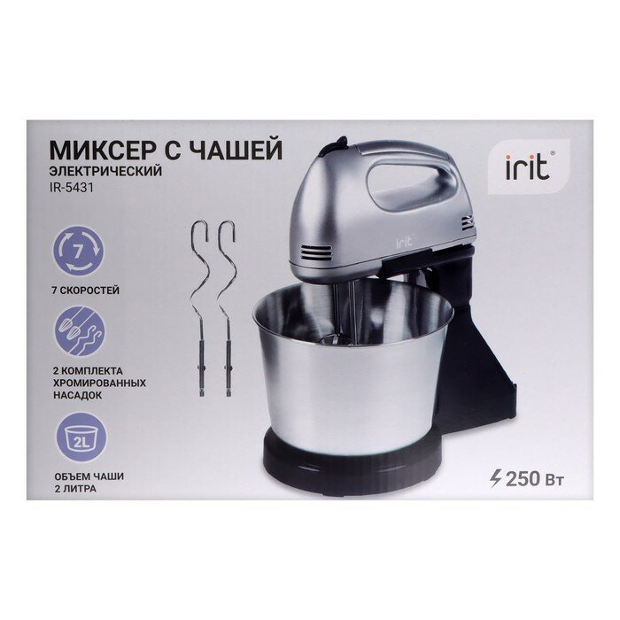 Миксер Irit IR-5431, стационарный, 250 Вт, 2 л, 7 скоростей, 4 насадки, серебристый