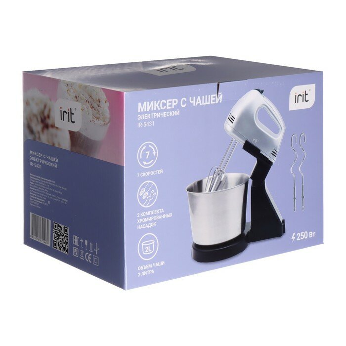 Миксер IR-5431, стационарный, 250 Вт, 2 л, 7 скоростей, 4 насадки, серебристый