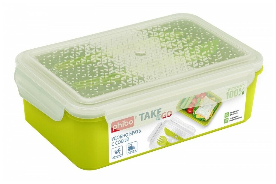 Контейнер герметичн. для хран.продукт/СВЧ TAKE&GO 1,1л прямоуг с приборами, зел 4331020 Phibo/Бытпласт (арт. 794759)