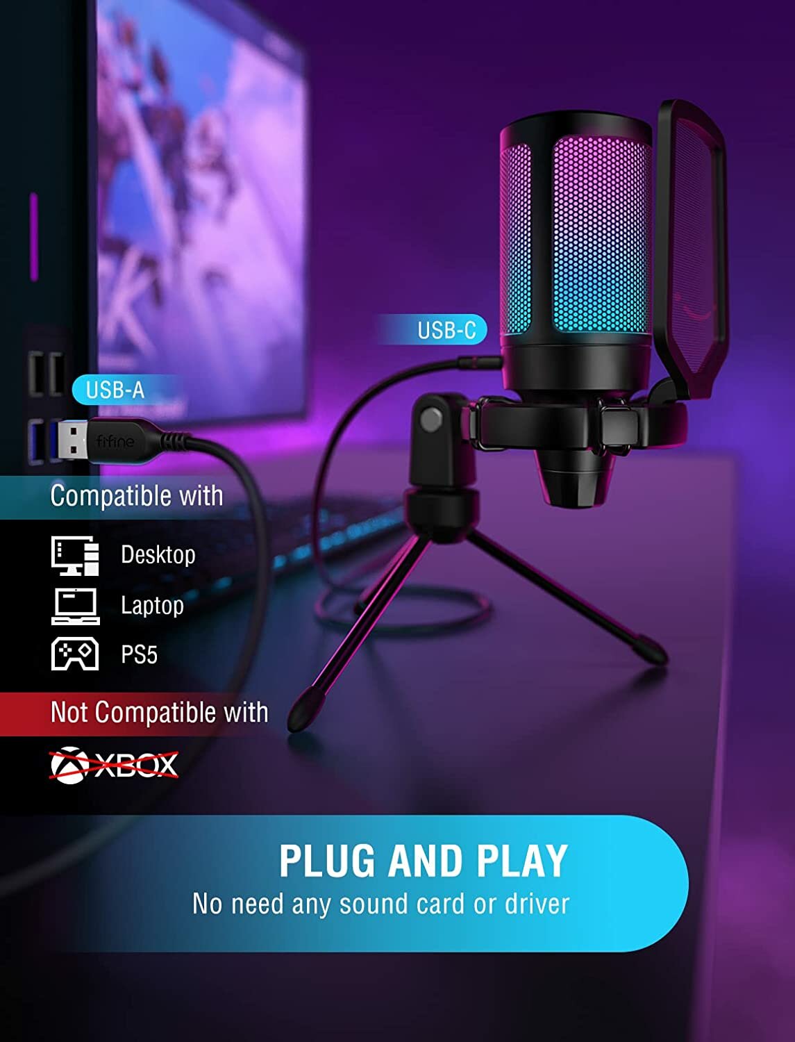 Конденсаторный USB Микрофон Fifine A6V Ampligame с RGB-подсветкой (компьютерный, игровой, для стримов, для конференций, Black)