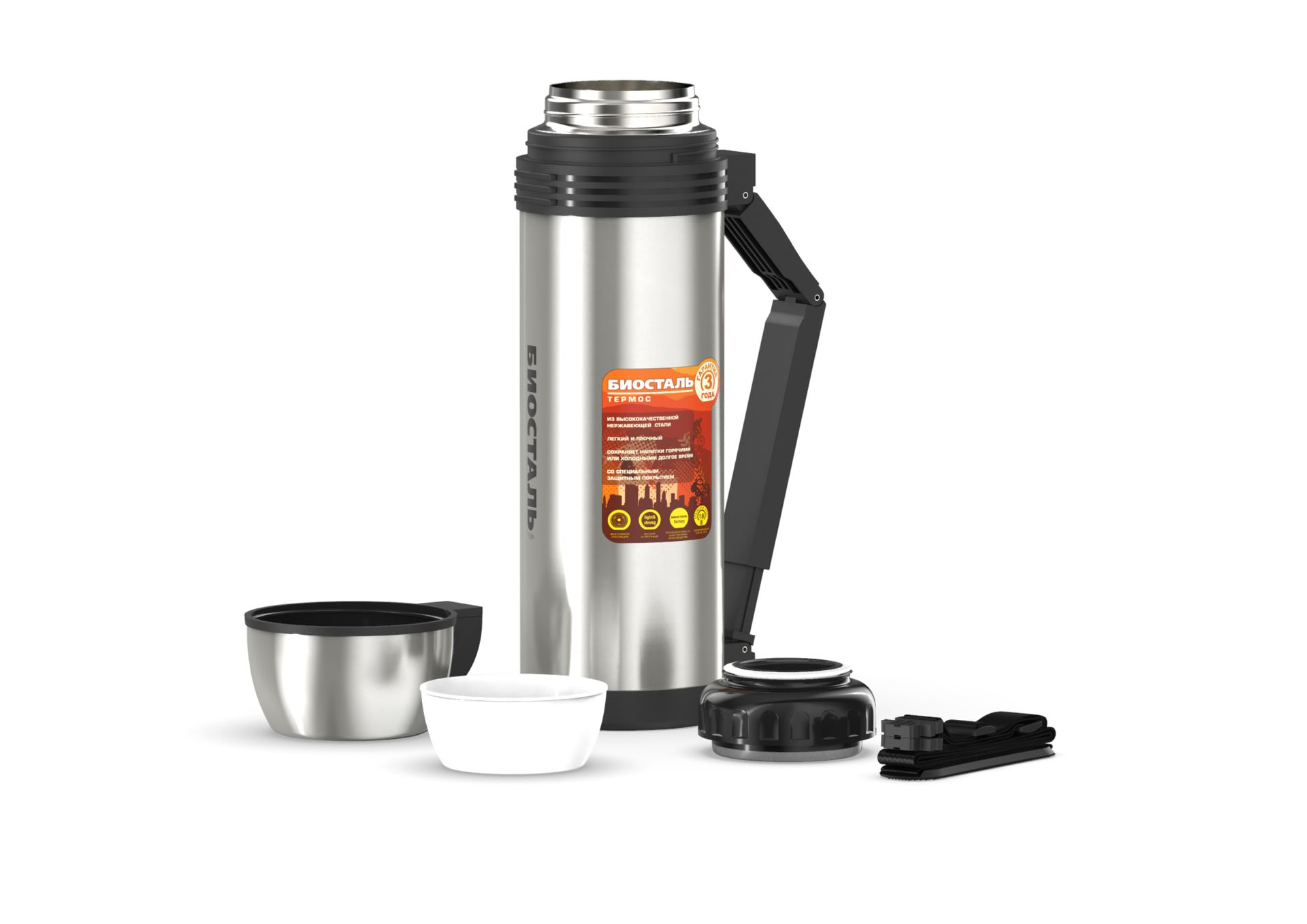 Термос 1.0л широкая горловина, сталь, с ручкой и ремешком "Спорт" BIOSTAL