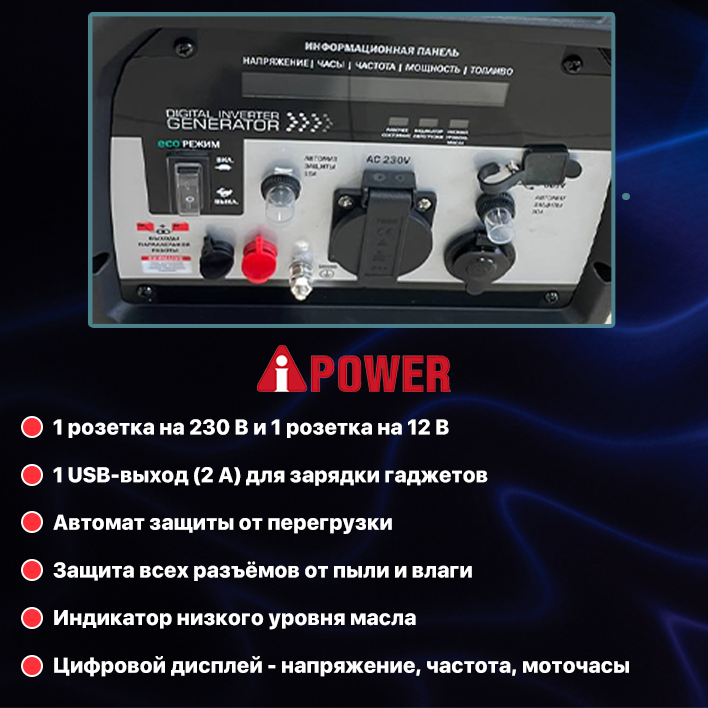 | Дополнительная информация | производитель двигателя A-iPower, USB розетка 2А, функция параллельного подключения( можно объединить мощность 2-ух генераторов с помощью специальных проводов) |