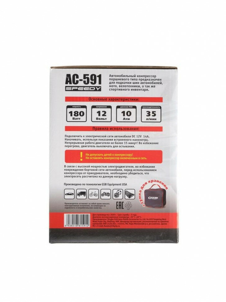 Компрессор автомобильный CityUP Speedy, АС-591, 12 В, 180 Вт, 10 атм, 35 л/мин
