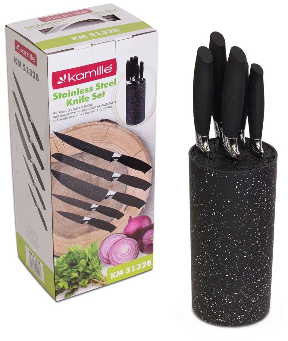 Набор ножей 6 предметов Kamille KM 5132B из нержавеющей стали с подставкой черный мрамор