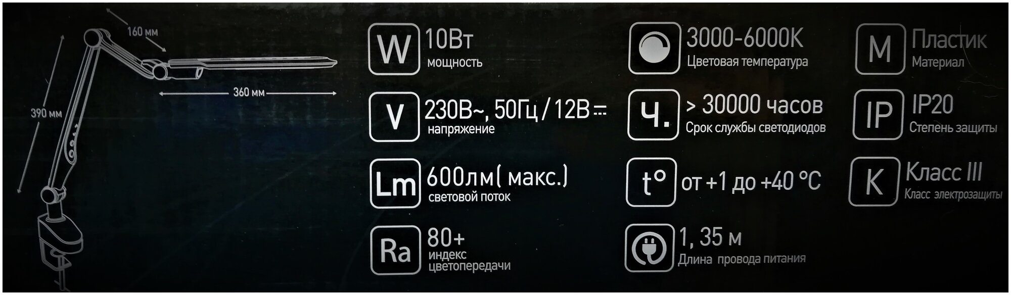 черн LED (Свет-к наст.,10 Вт,230В, на струбц.,600 лм,сенс.рег.ярк и цвет.темп.), CAMELION KD-830 C02 (1 шт.)