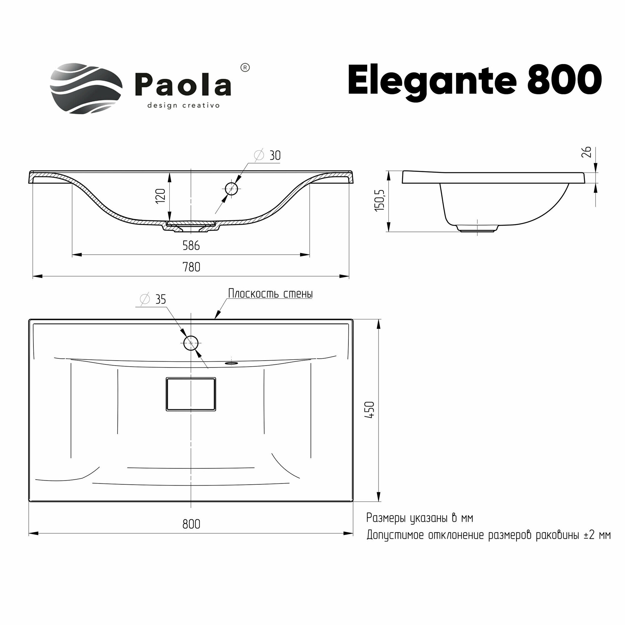 Раковина Paola Elegante полувстраиваемая, 80 см, прямоугольная