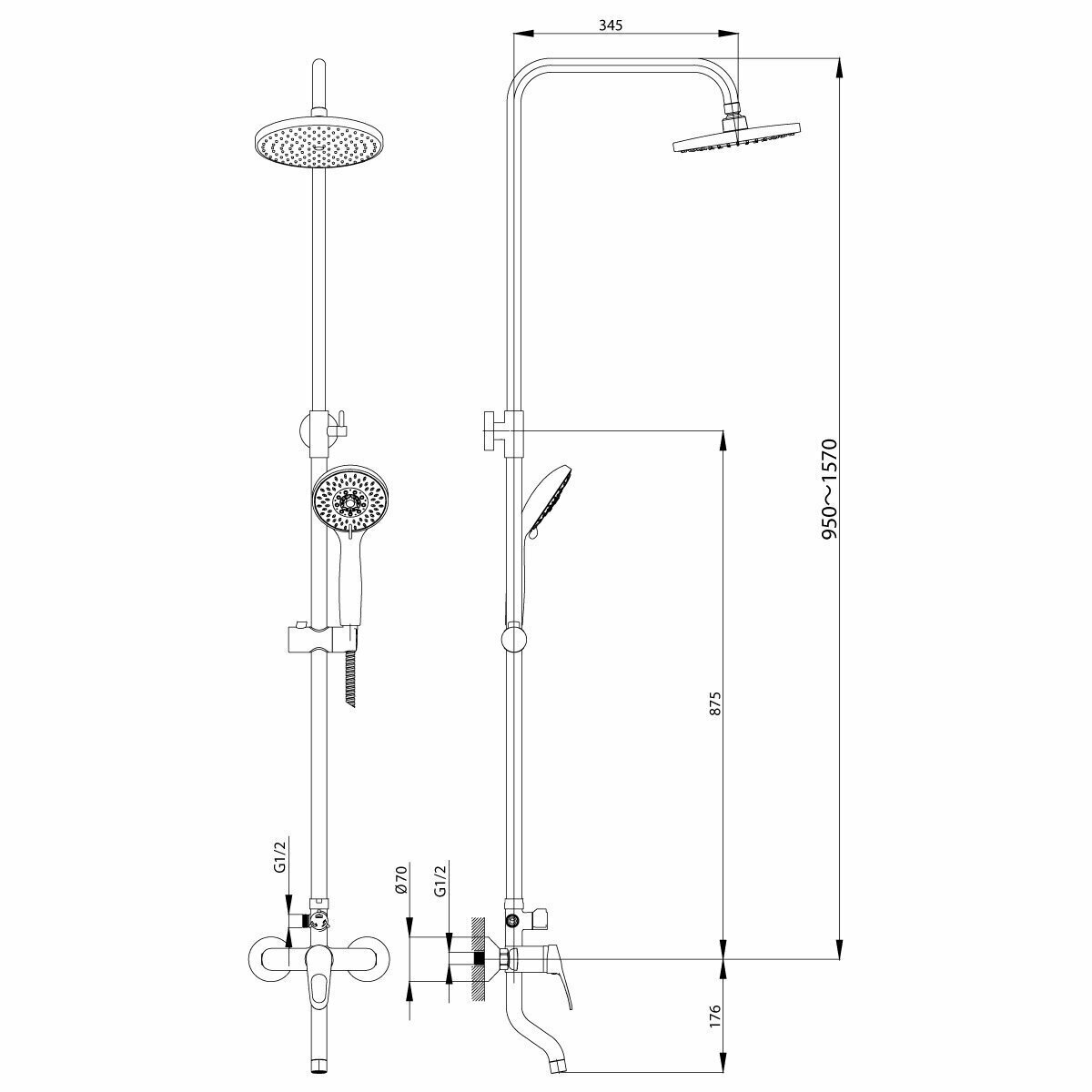 | Дополнительная информация | высота стойки для душа: 1585 мм; диаметр верхнего душа: 200 мм; крепление для ручной лейки регулируется по высоте |