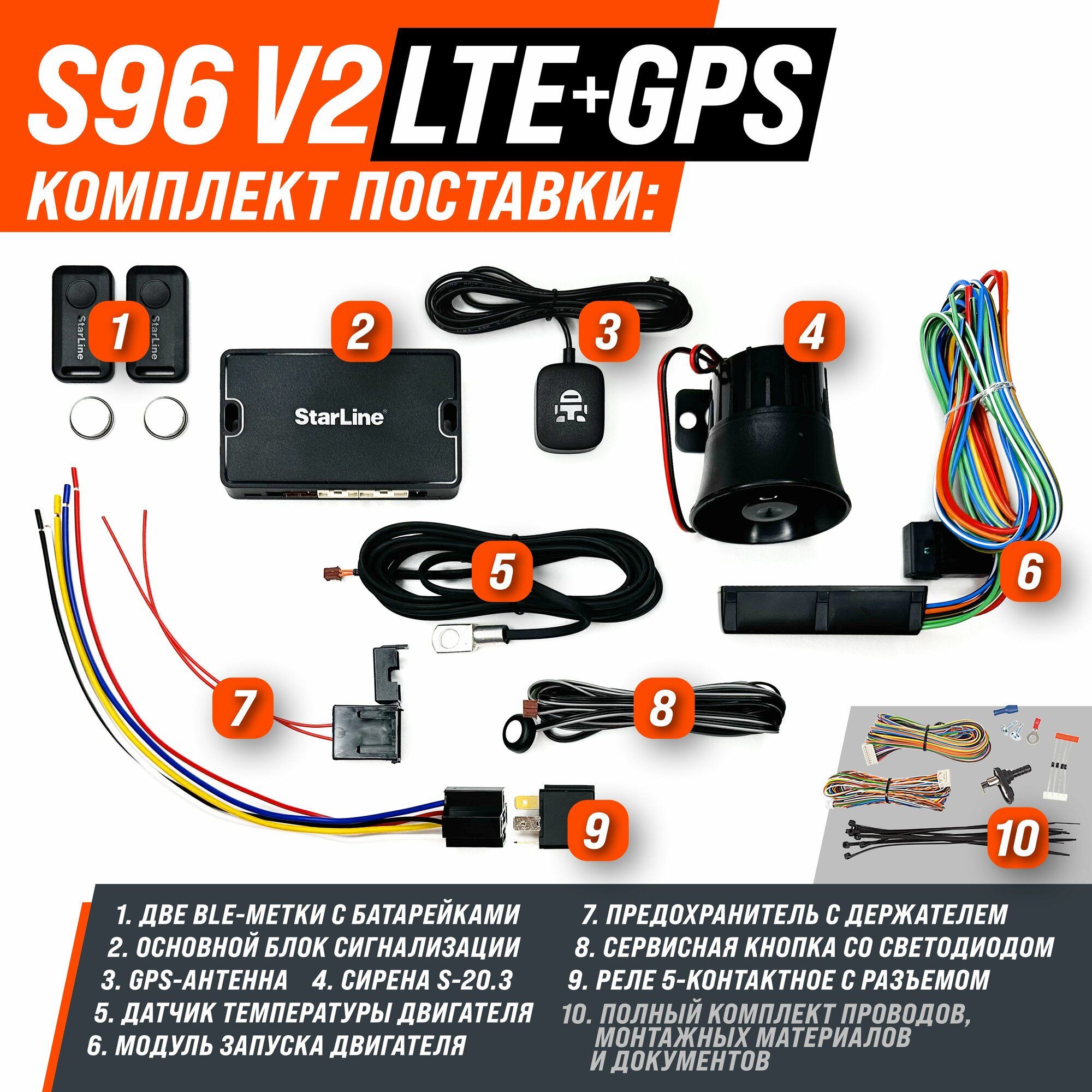 | Подробная комплектация | Брелок-метка BLE (2 шт.), Центральный блок с интегрированным 2CAN+4LIN интерфейсом, Bluetooth Smart интерфейсом, LTE интерфейсом, 3D датчиком удара/наклона/движения, SIM-чипом МТС и SIM-холдером, Модуль запуска двигателя, Датчик температуры двигателя, Кнопка со светодиодом, Предохранитель с держателем, Реле 5-контактное с разъемом, Сирена, Набор SIM-карт со специальным тарифом, Комплект проводов и монтажных материалов, Комплект печатной продукции |