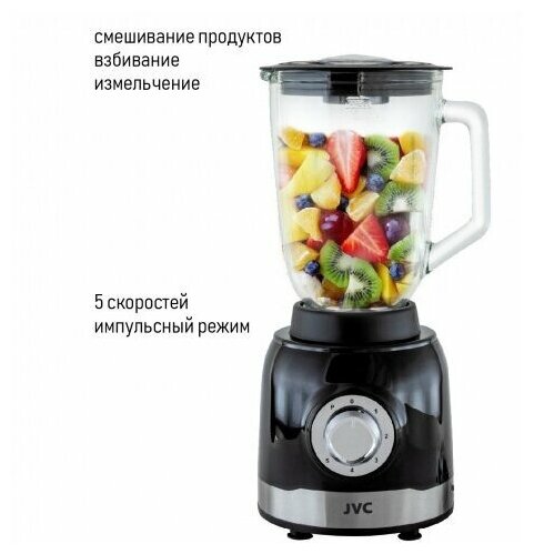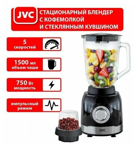 Блендер стационарный JVC c кофемолкой 250 мл, импульсный режим, 5 скоростей, стеклянный кувшин 1.5 литра, ножи из нержавеющей стали, 750 Вт