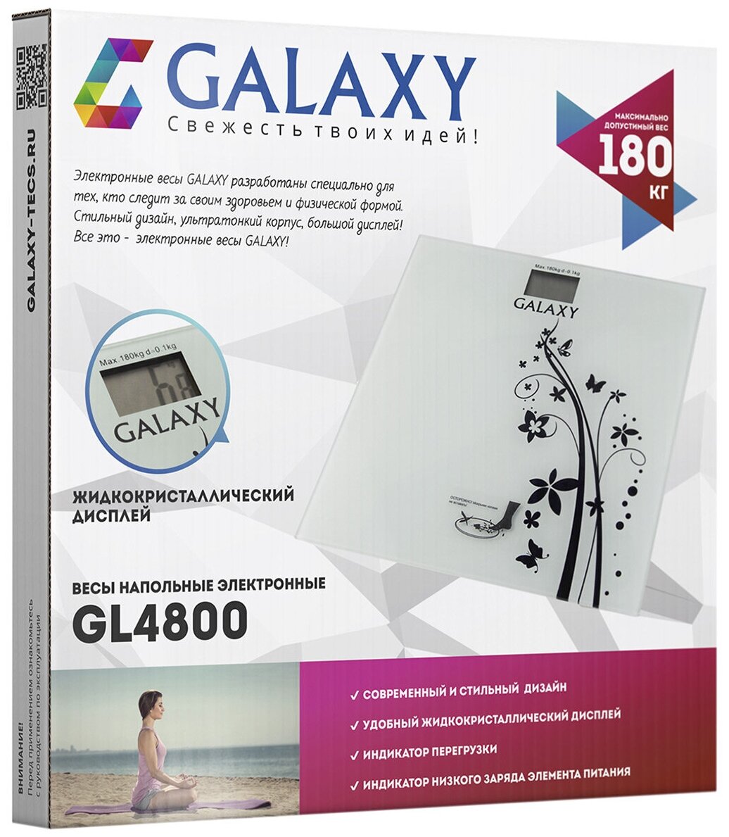 Купить GALAXY GL 4800 Весы напольные электронные, максимально допустимый вес 180 кг, элемент питания типа «CR2032» в комплекте, платформа из высокопрочного стекла, ЖК-дисплей, цена деления 100г, автоматическое отключение, индикатор перегрузки, единицы измерения: