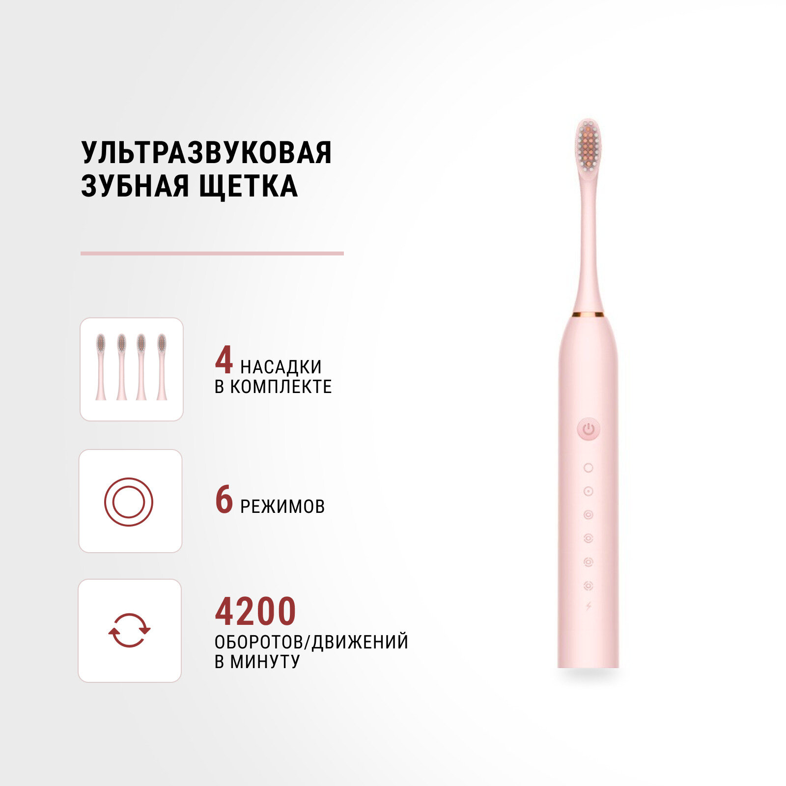 Электрическая зубная щётка , Звуковая электрическая зубная щетка с 4 насадками и 6 уникальными режимами. Цвет - розовый