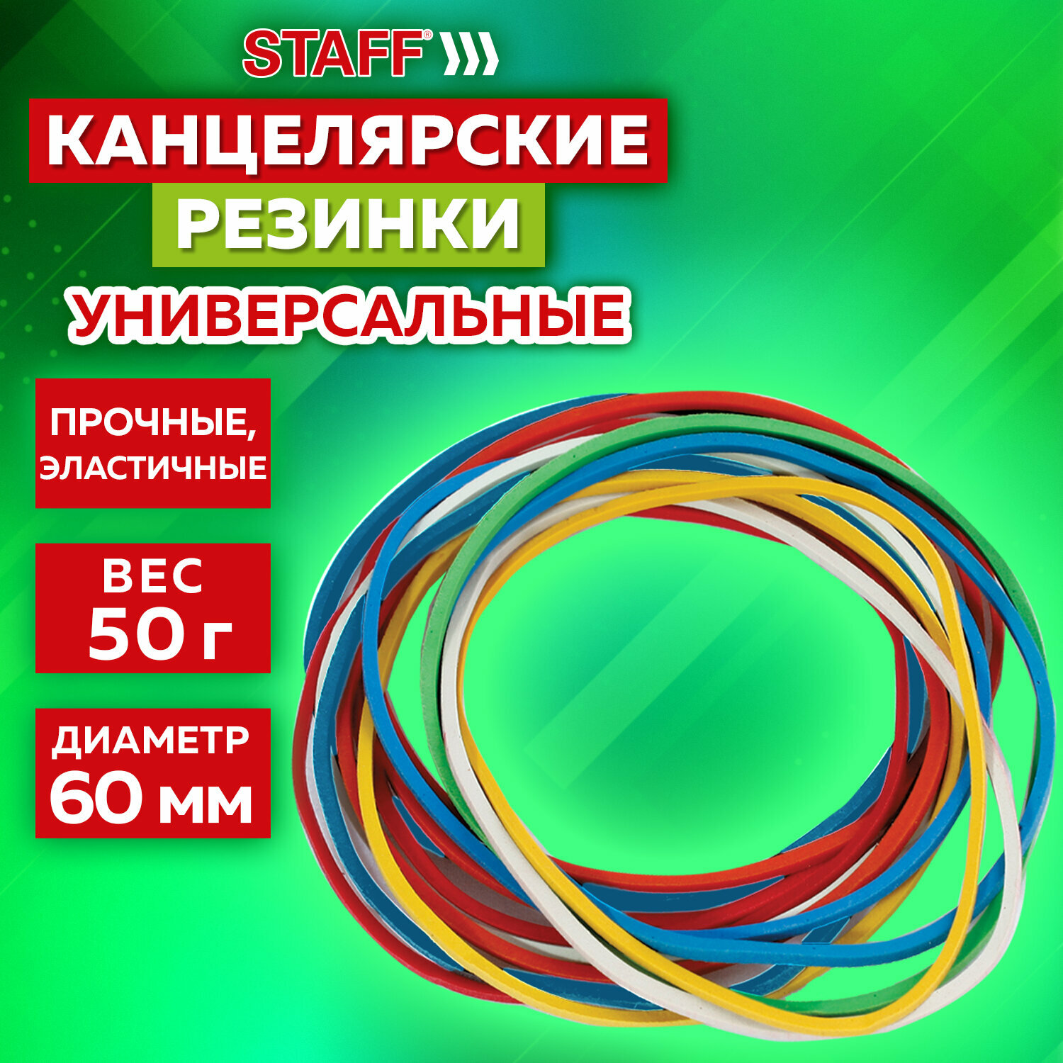 Резинки банковские универсальные диаметром 60 мм, STAFF 50 г, цветные, натуральный каучук, 440117