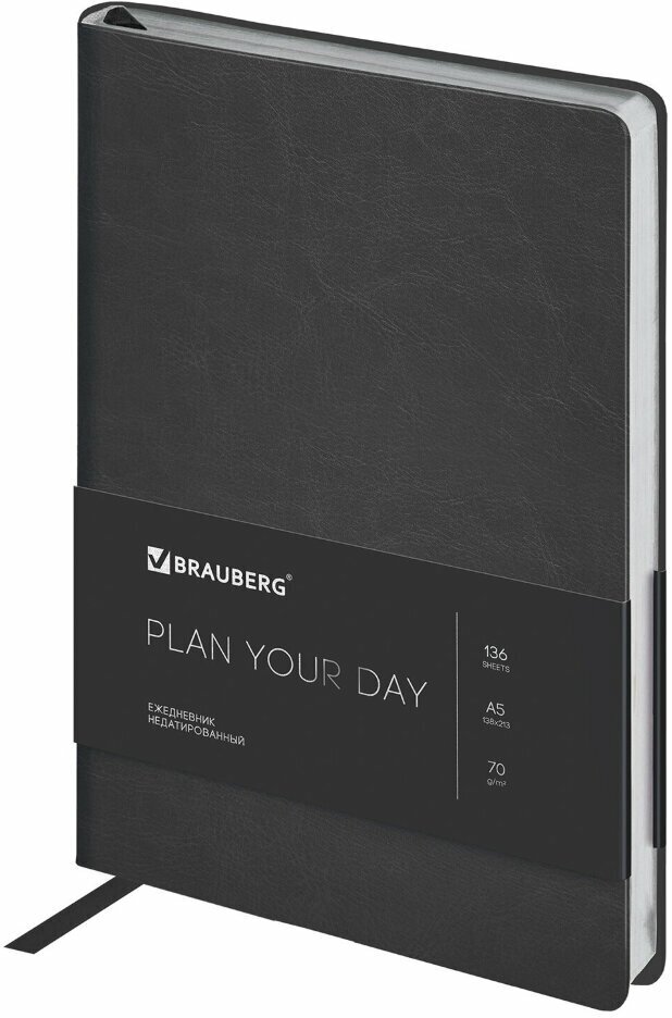 Ежедневник Brauberg Metallic, недатированный, А5, 138х213 мм, под кожу, 136 л., гибкий, черный