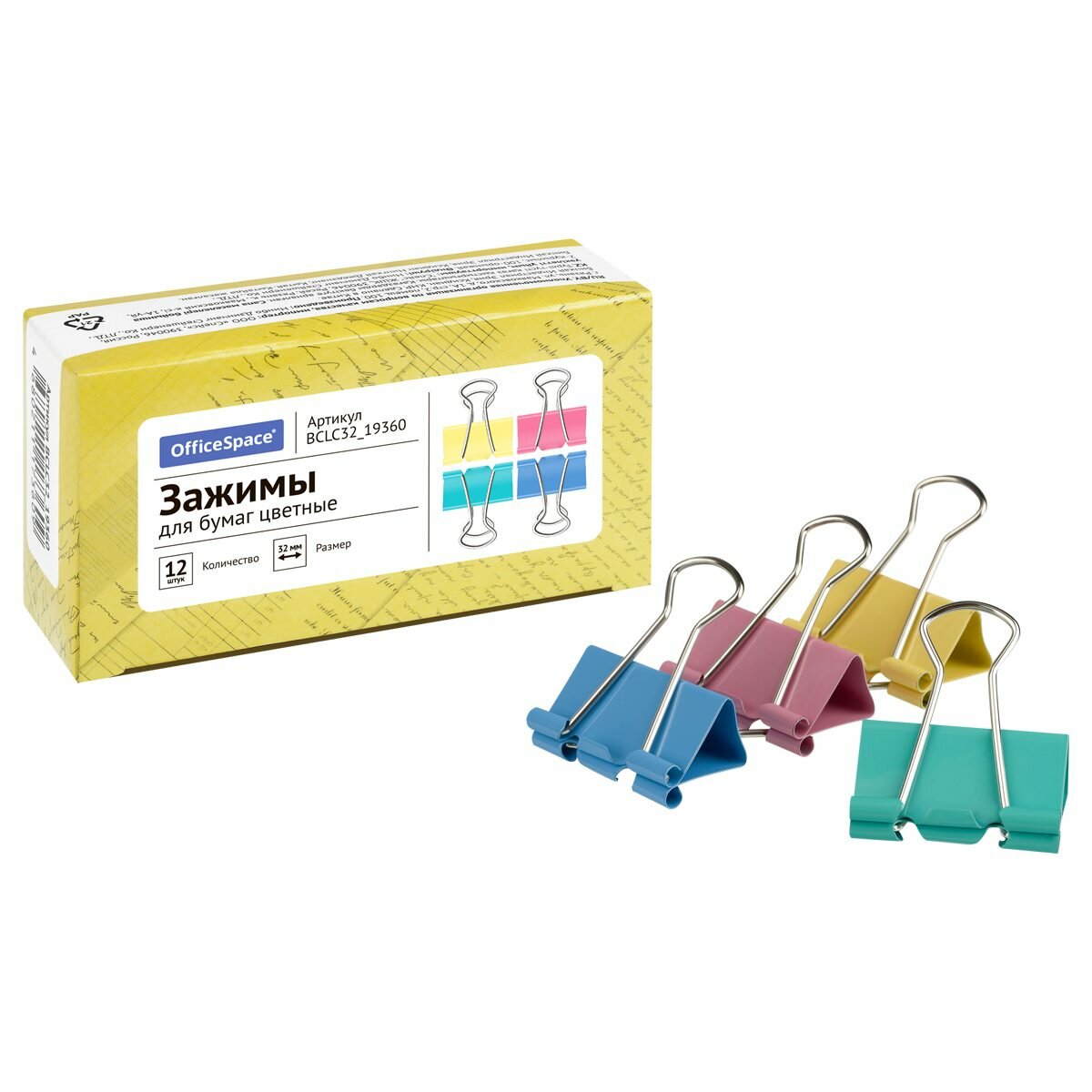 Зажимы для бумаг 32мм, OfficeSpace, 12шт., цветные, картонная коробка BCLC32_19360