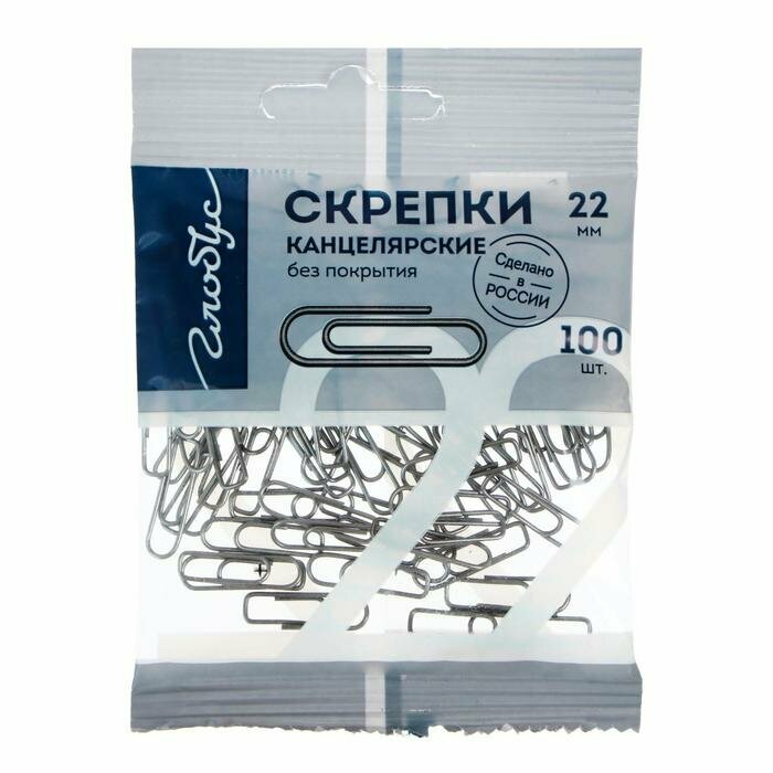 Скрепки канцелярские GLOBUS, 100 шт., 22 мм, без покрытия, флоу-пак