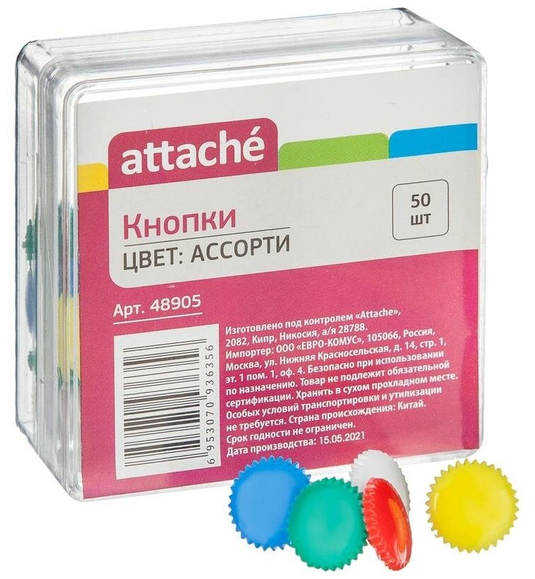 Кнопки канцелярские Attache пластиковые цветные (50 штук в упаковке), 48905