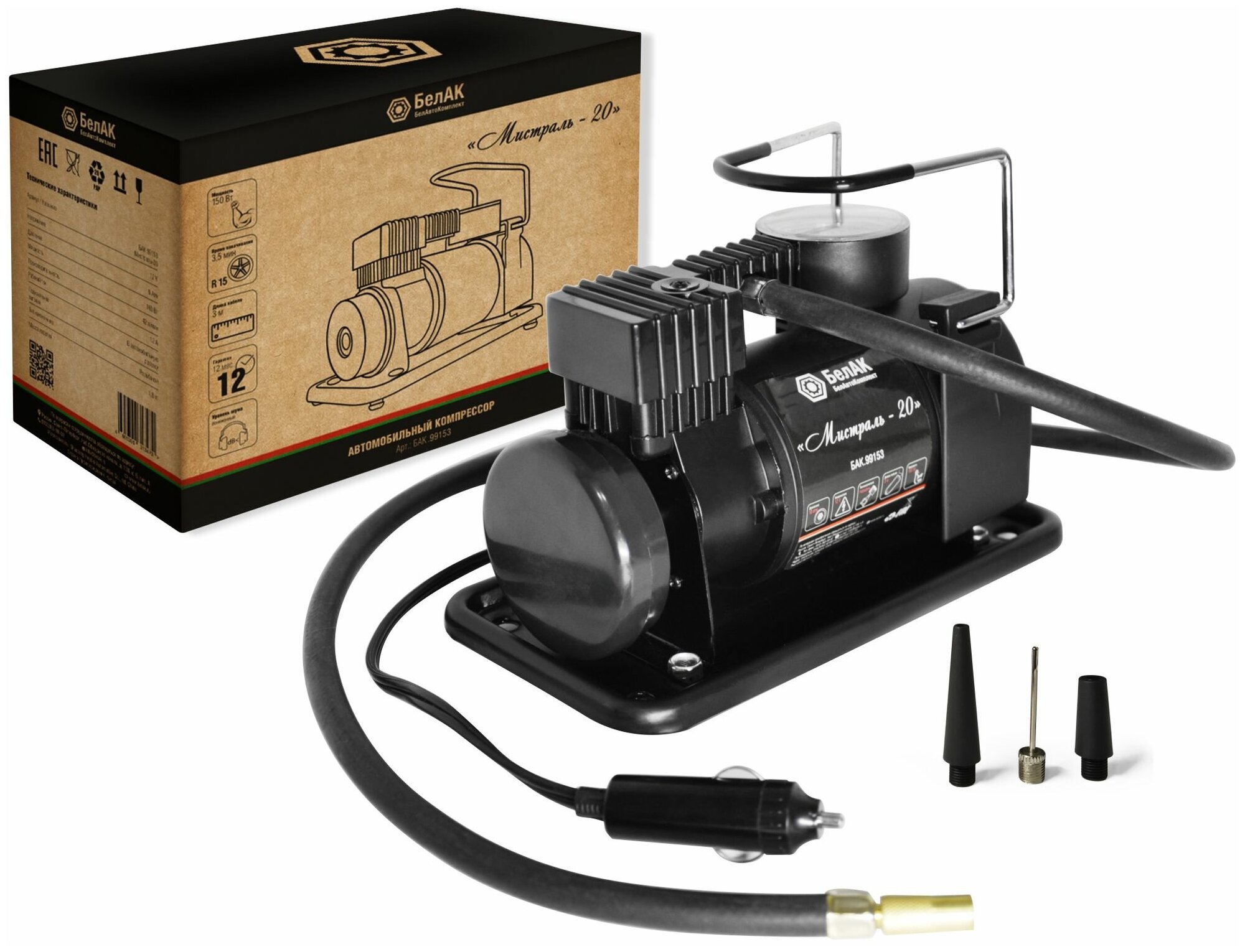 Белавтокомплект БАК99153 Компрессор для накачки шин "Мистраль -20" 12V 42 л/мин. "БелАК"
