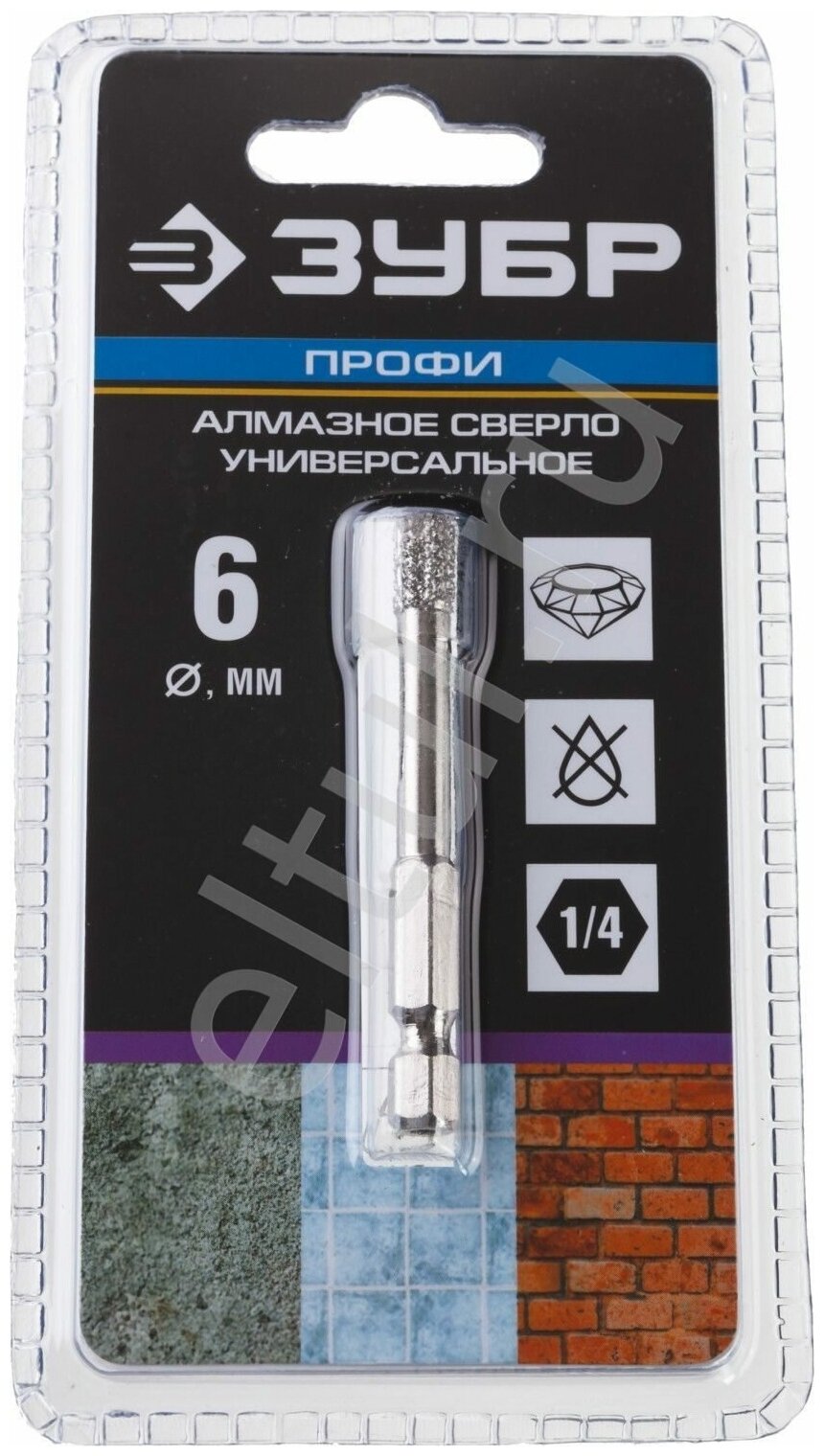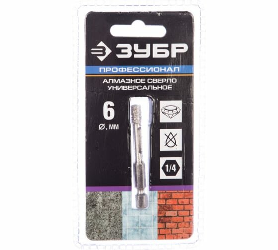 Сверло алмазное Зубр Профессионал 29865-06 универсальное, технология Ввс, d=6 мм, хвостовик HEX 1/4" .