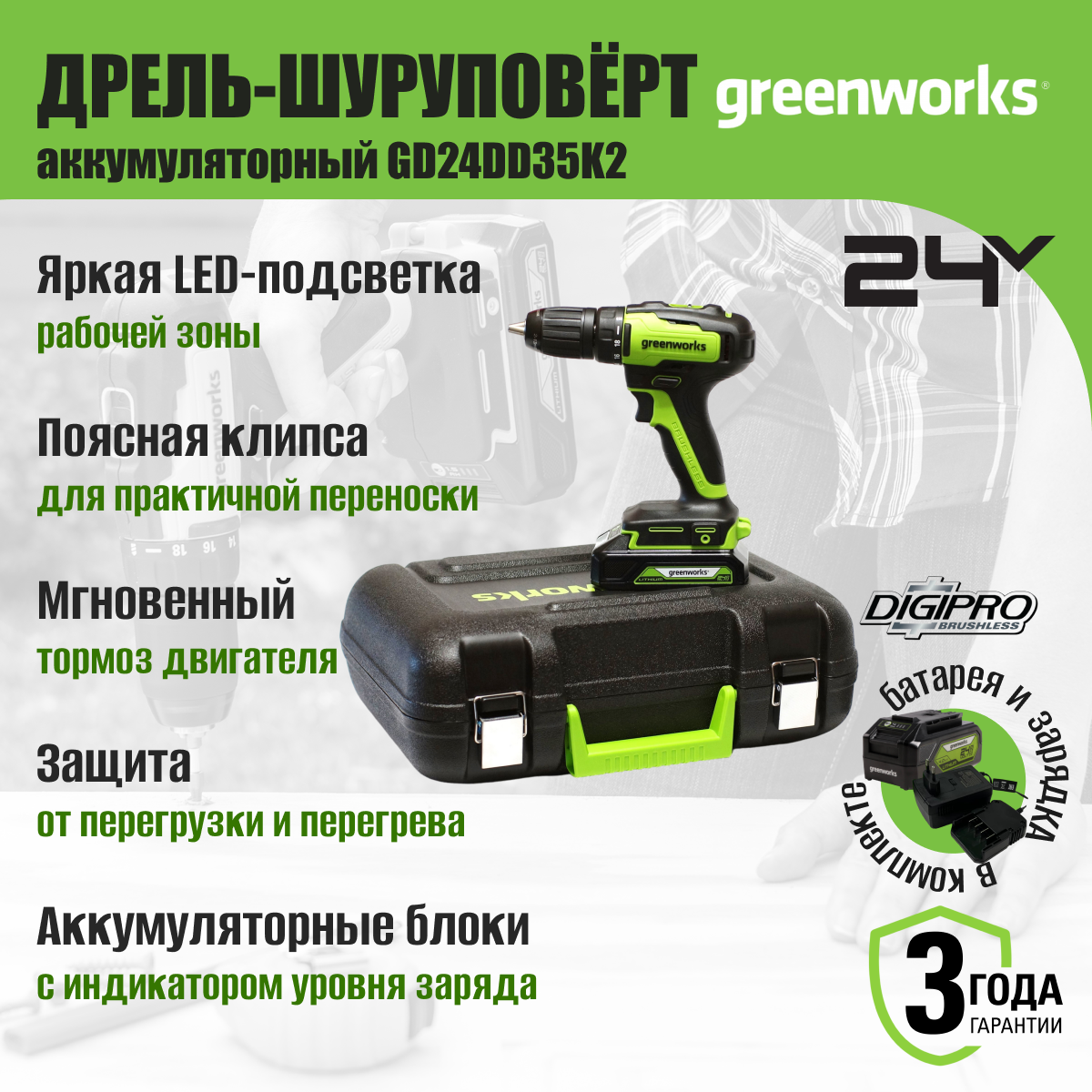 Дрель-шуруповерт Greenworks GD24DD35 3704007 24V 35Нм бесщеточная, без аккумулятора и зарядного устройства, арт. 3704007