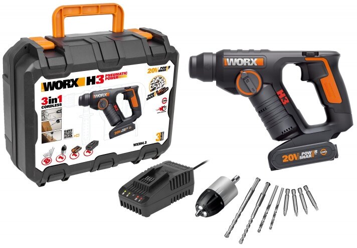 Перфоратор аккумуляторный WORX WX394.3, 20В 2Ач х1, ЗУ 2A, кейс
