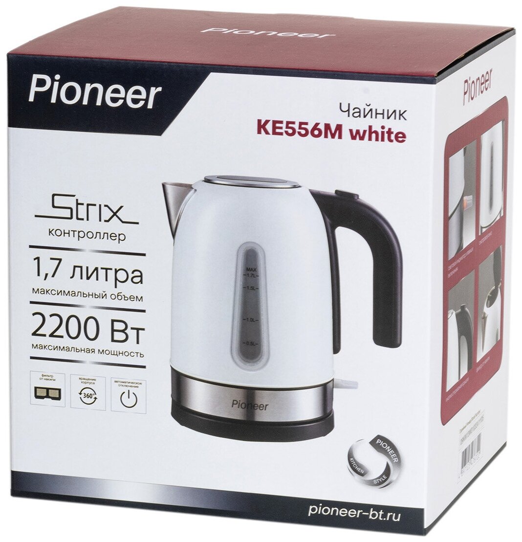 Чайник электрический Pioneer KE556M White 1,7 л, корпус из нержавеющей стали, контроллер STRIX, фильтр от накипи, 2200 Вт