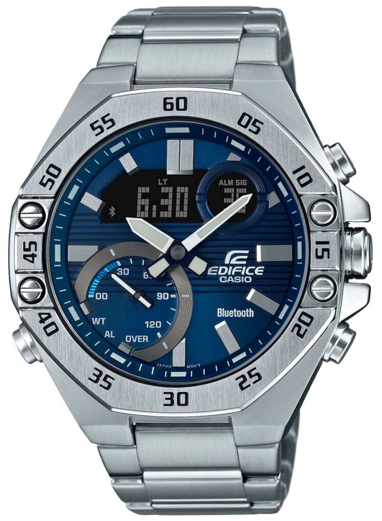 Наручные часы CASIO мужские Edifice ECB-10D-2A кварцевые, встроенная память, будильник, настройка времени с помощью приложения, хронограф, секундомер, таймер обратного отсчета, водонепроницаемые, подсветка стрелок, подсветка дисплея, серебряный