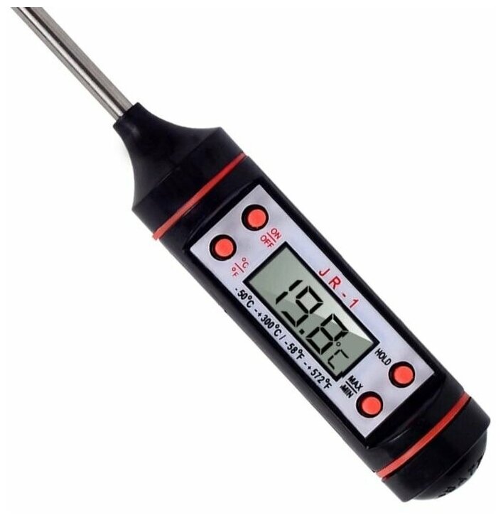| Отзыв: | Давно хотела купить такой щуп-термометр. Использую его при приготовлении мяса и выпечки, а также при сепарировании молока. Намного удобнее измерять температуру, чем обычным стеклянным. |