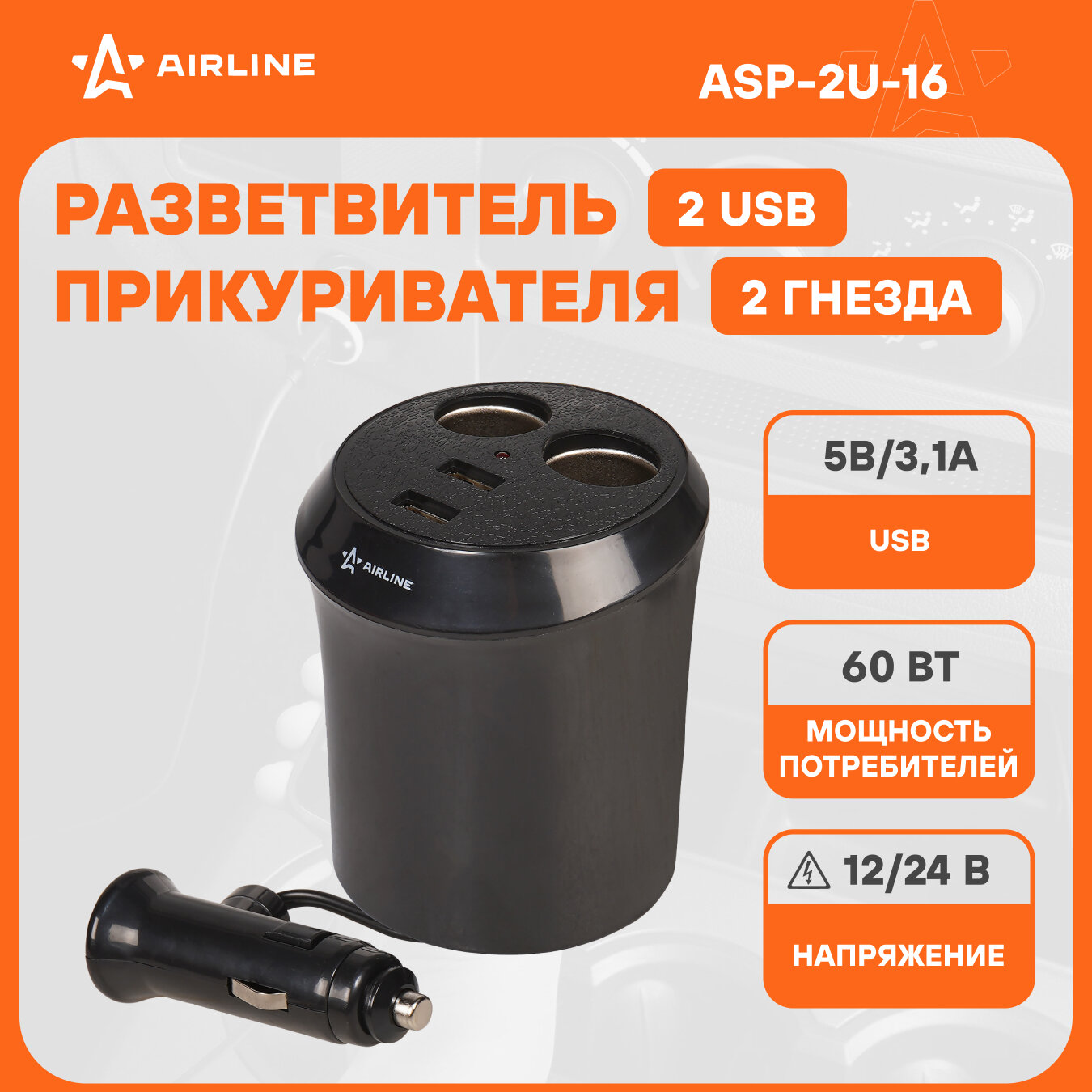 Разветвитель в прикуриватель AIRLINE ASP-2U-16