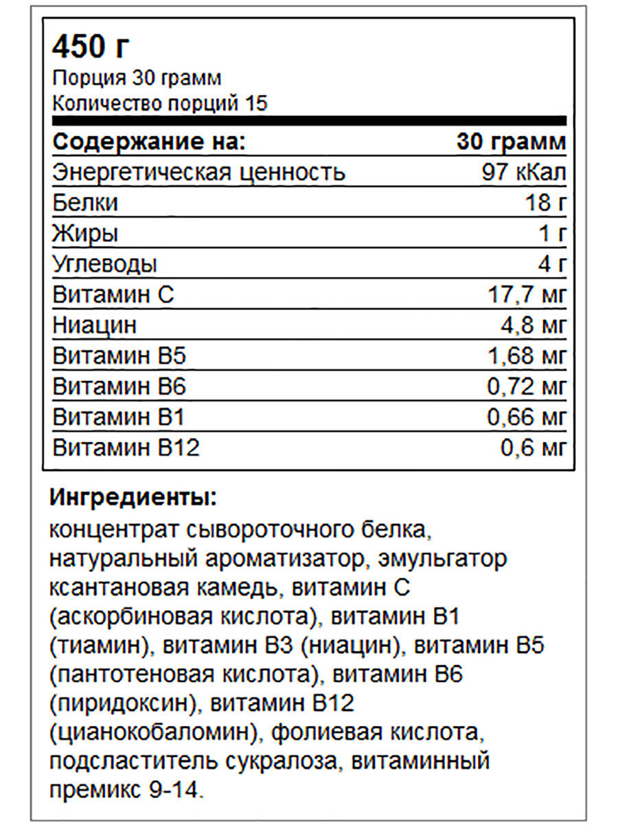 | Состав | концентрат сывороточного белка, какао-порошок алкализованный, ароматизатор, эмульгатор ксантановая камедь, витамин С (аскорбиновая кислота), витамин В1 (тиамин), витамин В3 (ниацин), витамин В5 (пантотеновая кислота), витамин В6 (пиридоксин), витамин В12 (цианокобаломин), фолиевая кислота, подсластитель сукралоза, витаминный премикс 9-14 |