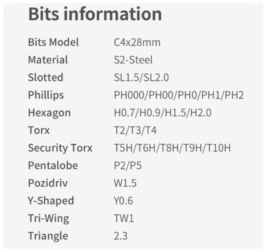 | Комплектация | отвертка, кейс, насадки: PH000, PH00, PH0, PH1, SL1.5, SL2.0, H0.7, H0.9, H1.5, H2.0, P2, P5, 2.3, W1.5, Y0.6, Y1, T2, T3, T4, T5H, T6H, T8H, T9H, T10H |