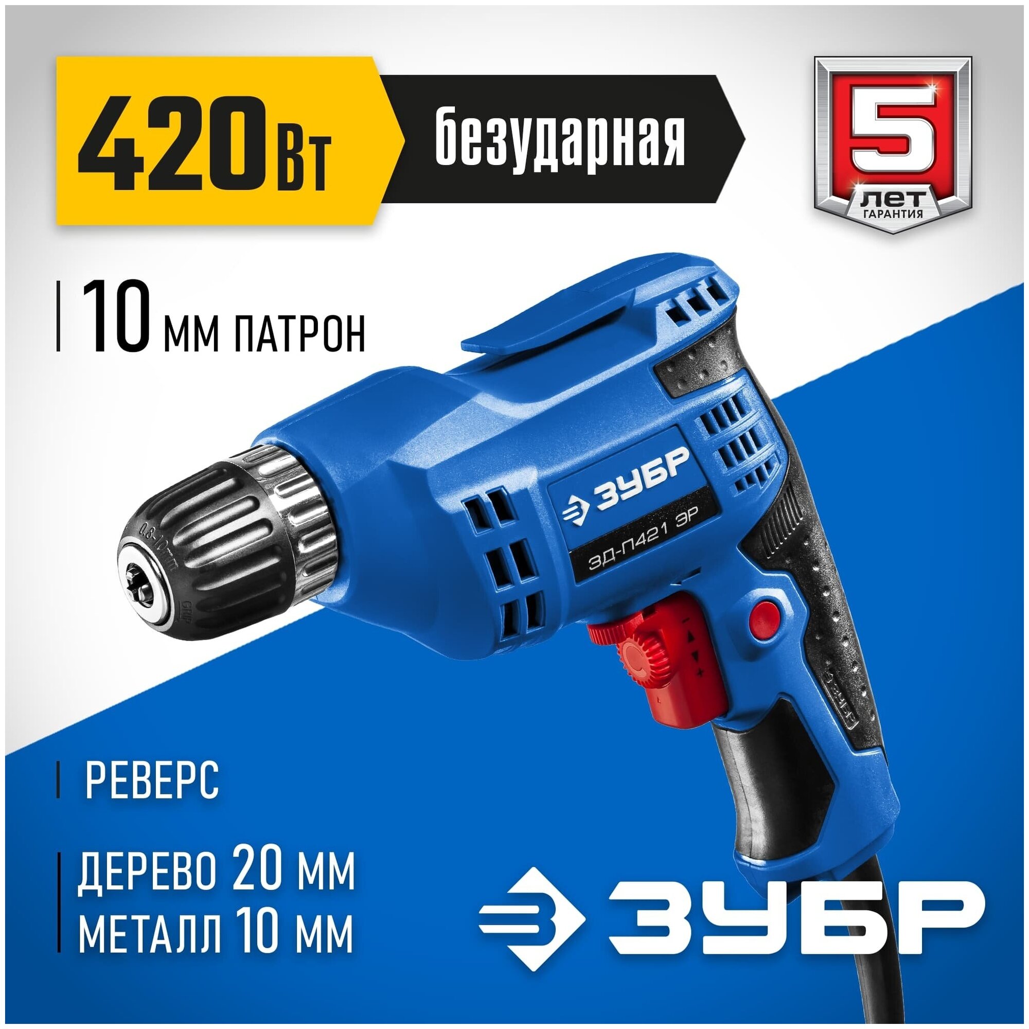 Дрель ЗД-П421 ЭР реверсивная, БЗП, 10 мм, 420 Вт ЗУБР Профессионал