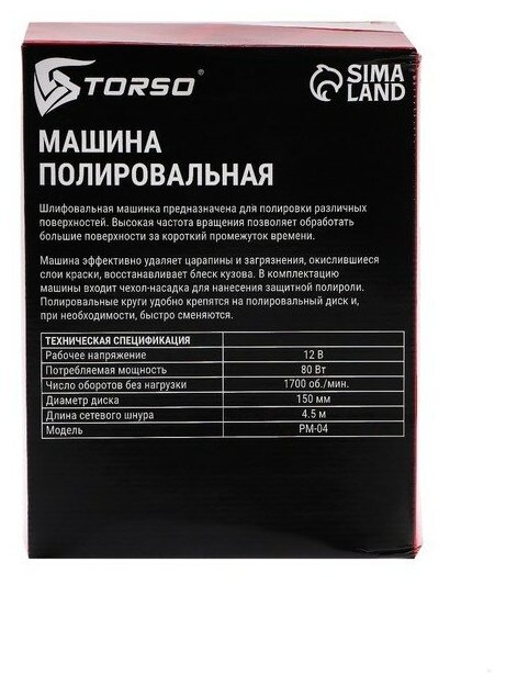 Машина полировальная Torso, 12 В, 80 Вт, 1700 об/мин, 150 мм, провод 4.5 м 2890166