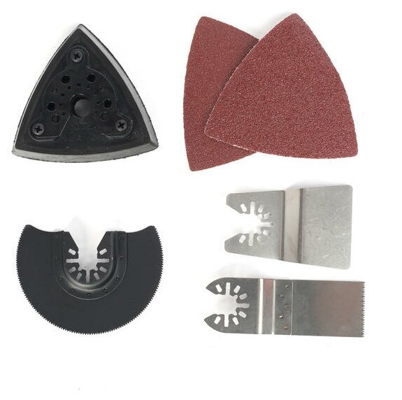 В комплекте 4 насадки, 2 шкурки гритность 40 и 80, и всё это в приличном кейсе для удобства хранениия, да и просто чтобы по гаражу не растерять. Мощности хватает, адски не нагружал, пользовался 2-мя насадками, резаком для дерева и платформой для шлифовки, для моих задач самый раз Покупкой доволен как слон))) |