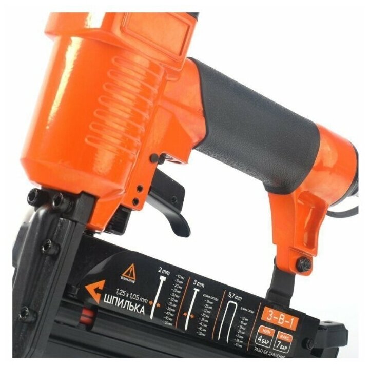 Пневмостеплер 3 в 1 PATRIOT ANG 210R, 85 л/мин; Скоба: Тип 90 (18GA), длина 13-40 мм, ширина -5,7 мм, сечение 1,25 х 1,0мм; Гвоздь: Тип 18 (18GA), длина 10-50 мм, сечение 1,25 х 1,0мм, шляпка 2мм; Гвоздь финишный: Тип 16 (16GA), длина 19-50 мм, сечение 1,