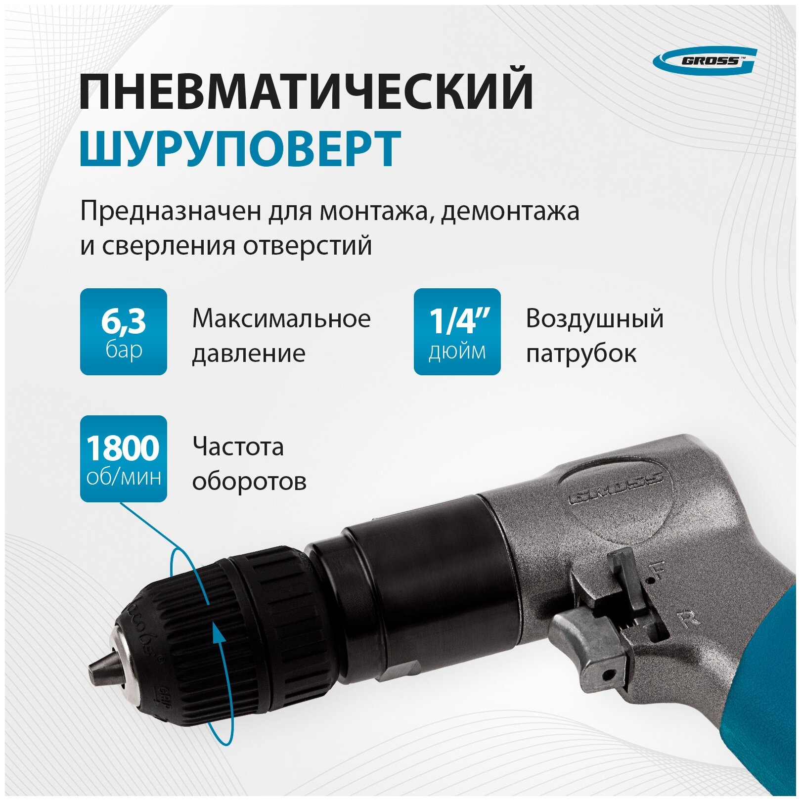 Дрель пневматическая G302, 3/8, 1800 об/мин, патрон 10 мм Gross GROSS