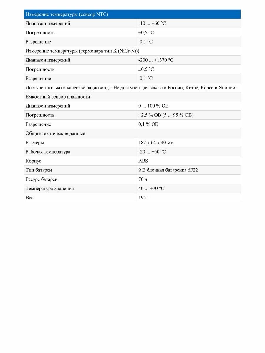 | Функции | измерение температуры / измерение влажности воздуха / определение точки росы / запись максимального и минимального значений / автовыключение / индикатор разряда батарей / подсветка экрана / удержание текущего показания |