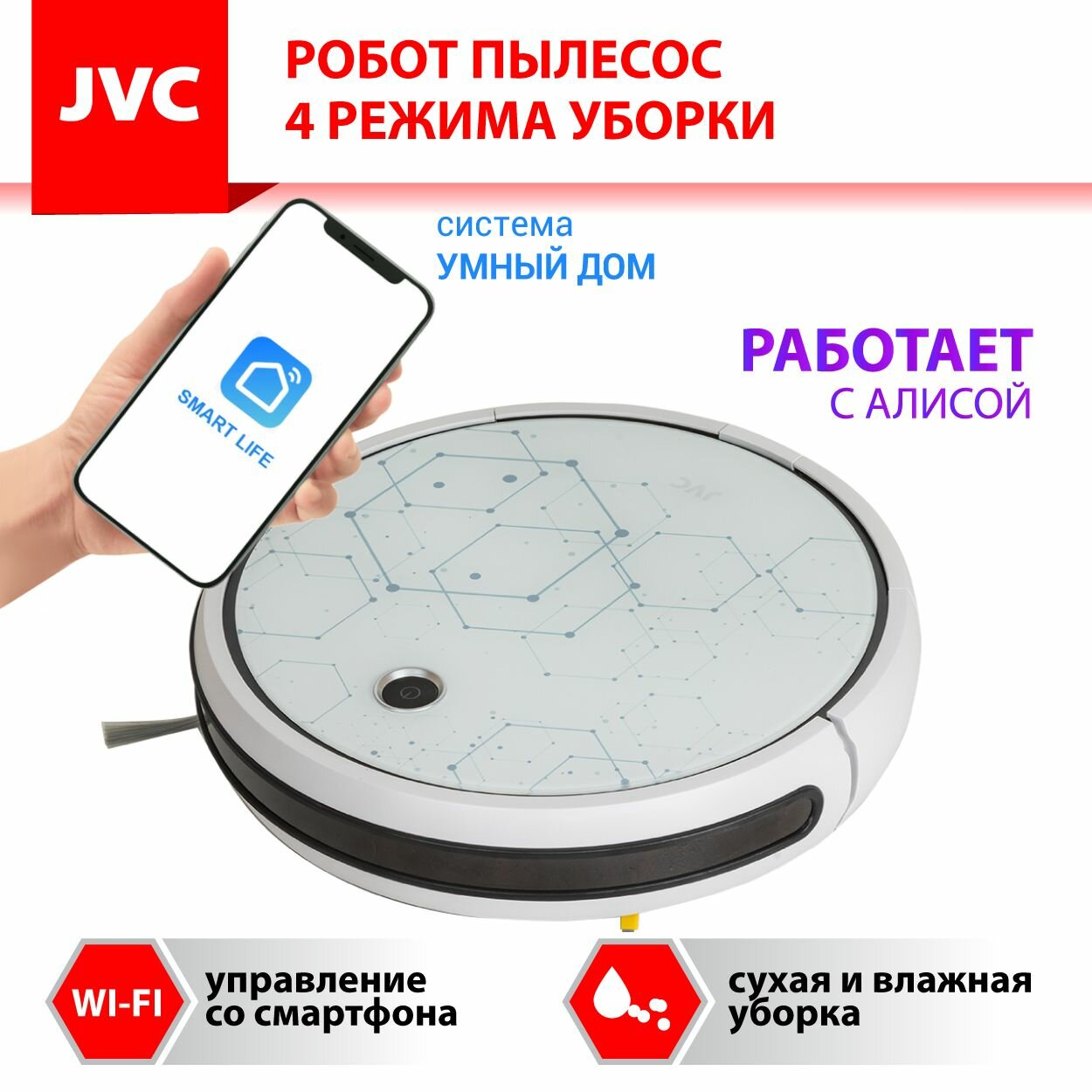 Купить Робот - пылесос JVC 2 в 1 сухая и влажная уборка, 4 режима, турбо щетка, HEPA фильтр, голосовой помощник, смартфон-управление Smart life, Wi-Fi