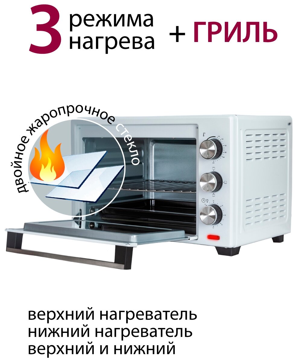 Мини-печь Pioneer 25 литров с грилем, регулировкой температуры, 3 режима нагрева / Печка с двойным жаропрочным стеклом / Электропечь / Печь духовка