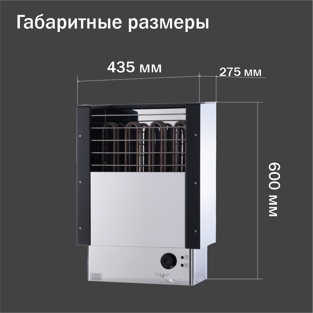 | Плюсы: | Отличная печка, через 2,5-3 часа уже держит 92°. Объем парилки 9 кубов. |